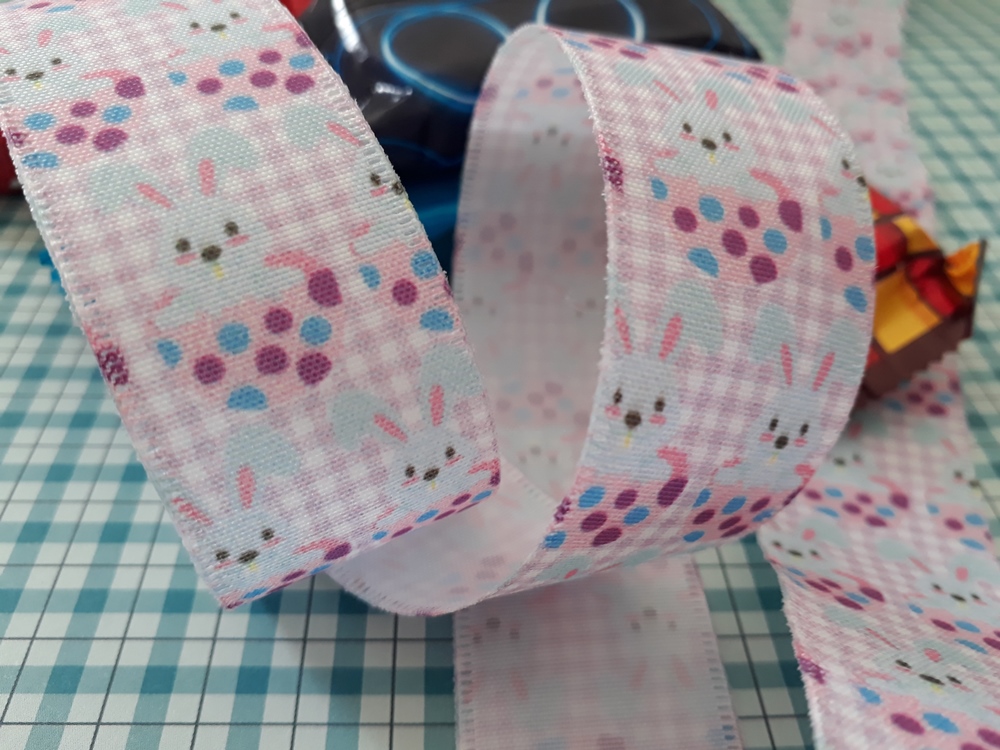 9,50 metros de fita decorativa com estampa digital (27mm) fundo xadrez lilás com estampa de coelhinhos, azul claro dentro de metades de ovos, cor-de-rosa com bolinhas azuis e uva .