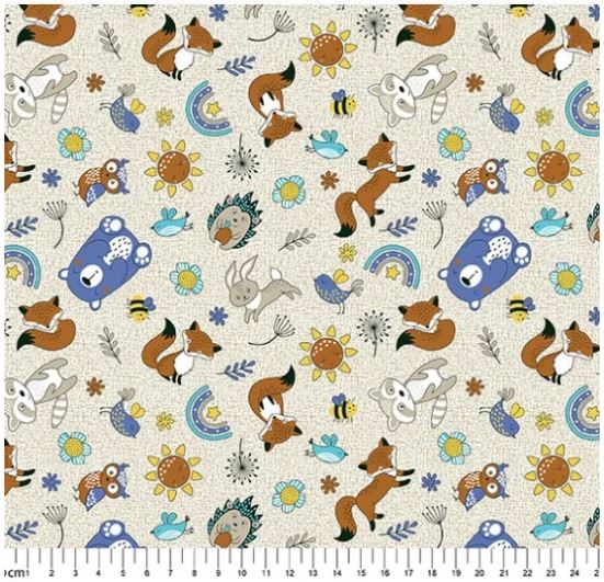 Corte de tecido 100% algodão bege craquelado bege estampado com animais (urso, raposa, guaxinim, coelho, coruja, passarinho, porco espinho e abelha), sol, arco íris, flores e folhas. Coleção Fábula